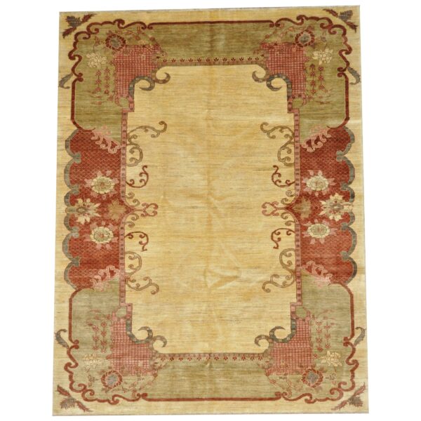 The design of this rug originates from Antique Turkish Oushak rugs which are extremely rare and expensive. The Afghan weavers have been able to re-create these beautiful rugs which resemble similarities to the originals, with high quality hand-spun wool and pure vegetable dyes. The antique Turkish Oushak design has been reproduced by Afghan weavers in the villages of northern Afghanistan by the Turkoman and Hazara tribes. This particular rug was made by village weavers settled in central Afghanistan using traditional methods of weaving. The process of making a rug includes cleaning, washing and dyeing the wool which is sourced from local villages.