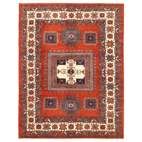 Kazaks are a type of Armenian rug that were woven in the south of the Caucasus region, between Tiflis and Erevan. The production of rugs in the Caucasus region is limited, only done in a few villages, therefore these beautiful designs are being reproduced by Afghan weavers in the northern (Turkoman tribes) and central (Hazara tribes) parts of Afghanistan. This particular rug was woven by the village weavers within the Hazara tribe in the Bamyan province of Afghanistan. Those vegetable dyes most commonly used are madder, the root of a spindly bush which grows abundantly in many carpet-producing area which is used to create a red color. Walnut peel is used for dark brown, pomegranate peel for light brown, and sparak which is a wild flower from the steppes, used for yellow.