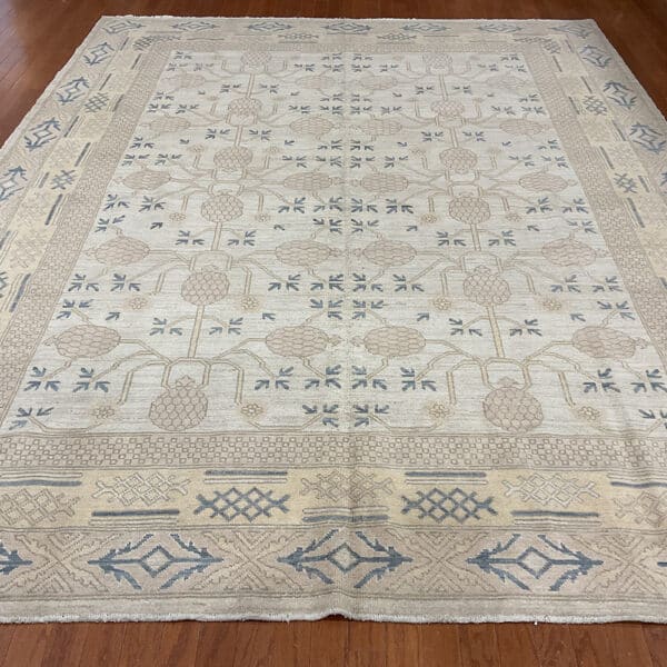 These Khotan rugs were originally produced in the city of Khotan, which was located in Eastern Turkestan. Khotan villages produced beautiful rugs throughout the 18th and 19th centuries. The designs are characterized by geometric repetitive patterns. The designs are traditional and follow older patterns yet have a modern look for today’s homes. This particular rug was made by village weavers settled in central Afghanistan using traditional methods of weaving. The process of making a rug includes cleaning, washing and dyeing the wool which is sourced from local villages.