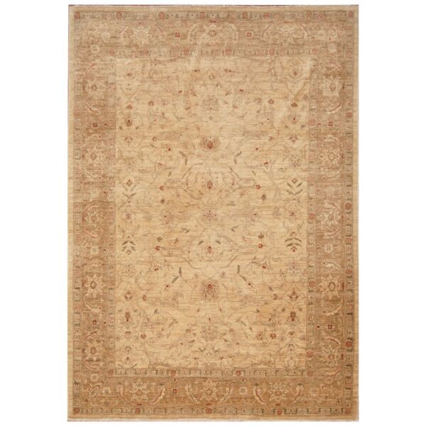 The design of this rug originates from Antique Turkish Oushak rugs which are extremely rare and expensive. The Afghan weavers have been able to re-create these beautiful rugs which resemble similarities to the originals, with high quality hand-spun wool and pure vegetable dyes. The antique Turkish Oushak design has been reproduced by Afghan weavers in the villages of northern Afghanistan by the Turkoman and Hazara tribes. This particular rug was made by village weavers settled in central Afghanistan using traditional methods of weaving. The process of making a rug includes cleaning, washing and dyeing the wool which is sourced from local villages. Those vegetable dyes most commonly used are madder, the root of a spindly bush which grows abundantly in many carpet-producing area which is used to create a red color. Walnut peel is used for dark brown, pomegranate peel for light brown, and sparak which is a wild flower from the steppes, used for yellow.