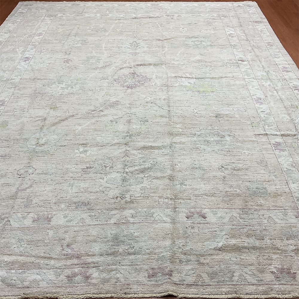 The design of this rug originates from Antique Turkish Oushak rugs which are extremely rare and expensive. The Afghan weavers have been able to re-create these beautiful rugs which resemble similarities to the originals, with high quality hand-spun wool and pure vegetable dyes. The antique Turkish Oushak design has been reproduced by Afghan weavers in the villages of northern Afghanistan by the Turkoman and Hazara tribes. This particular rug was made by village weavers settled in central Afghanistan using traditional methods of weaving. The process of making a rug includes cleaning, washing and dyeing the wool which is sourced from local villages.