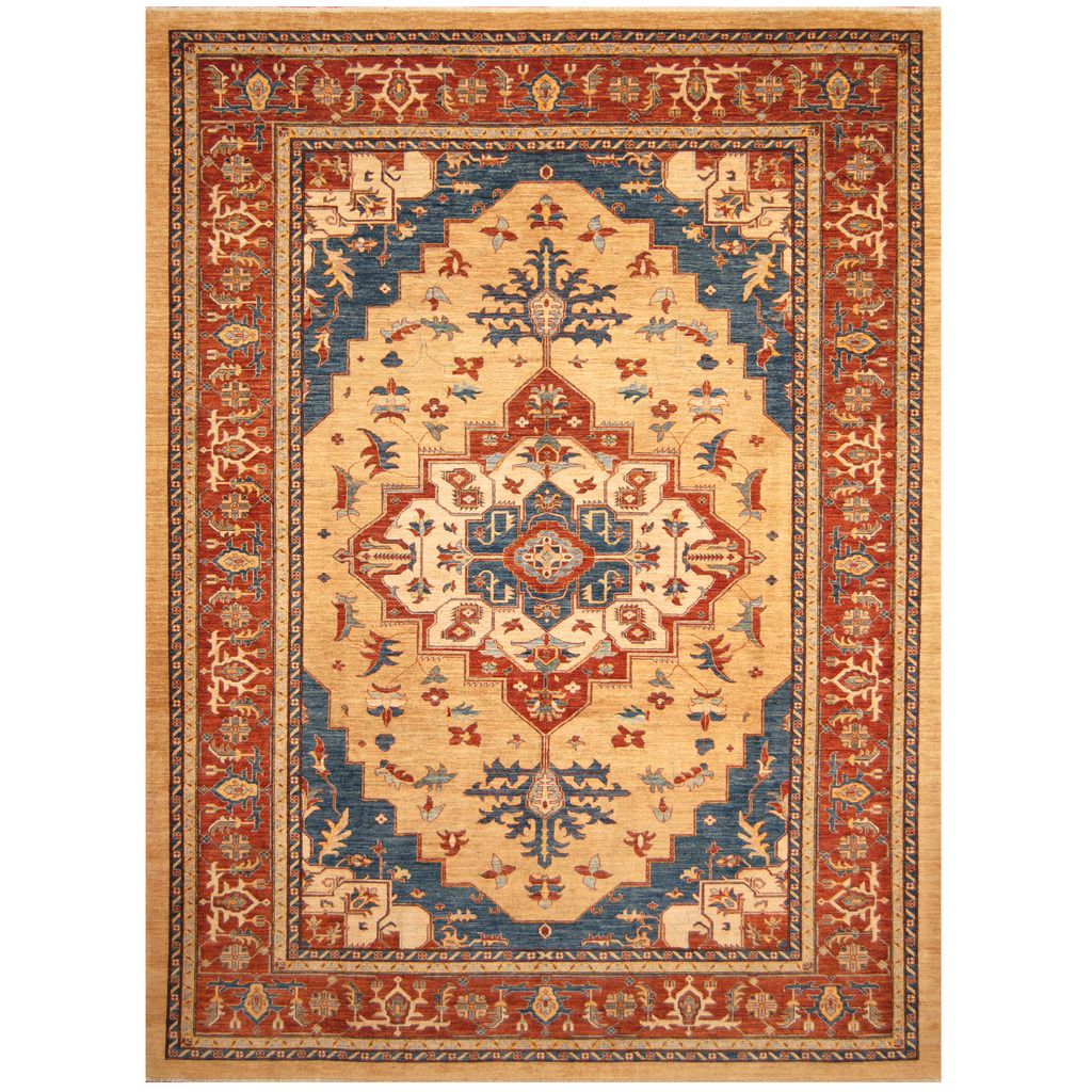 Serapi is a trade name given to better quality versions of Heriz rugs thought to have been woven before 1900. Heriz rugs are very famous with rug collectors today as they have their own unique style and are easily distinguishable from other rug styles. This particular rug is the Persian Serapi design but created with more up to date colors. This rug was made by Afghan refugees in the Pakistani camps. The weavers get their wool from local villages and they complete the entire process of cleaning and dyeing. The weavers no longer live in the camps and have moved back to Afghanistan after the fall of the Taliban government. Those vegetable dyes most commonly used are madder, the root of a spindly bush which grows abundantly in many carpet-producing area which is used to create a red color. Walnut peel is used for dark brown, pomegranate peel for light brown, and sparak which is a wild flower from the steppes, used for yellow.
