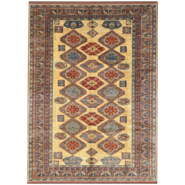 Kazaks are a type of Armenian rug that were historically woven in the southern portion of the Caucasus region of the Middle East. The production of rugs in that region is limited to the villages practicing traditional weaving, therefore these beautiful designs are reproduced by Afghan weavers in the northern and central parts of Afghanistan. Local elements of design and construction bring a unique beauty to the ancient patterns that the weavers create. Super Kazaks have a finer quality of wool and higher knot count per square inch compared to the regular Kazaks. The process of making a rug includes cleaning, washing and dyeing the wool which is sourced from local villages. Those vegetable dyes most commonly used are madder, the root of a spindly bush which grows abundantly in many carpet-producing area which is used to create a red color. Walnut peel is used for dark brown, pomegranate peel for light brown, and sparak which is a wild flower from the steppes, used for yellow.