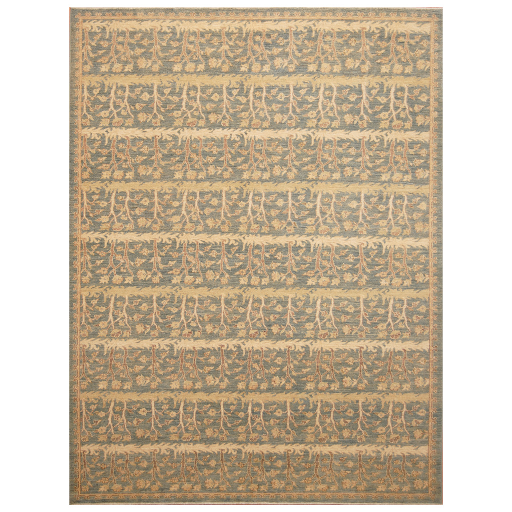 One name associated with English rugs is William Morris, who was an artist, writer, designer, and social activist. His designs included floral motifs with arabesques, influenced by Persian styles. The dominant colors used in William Morris designs were blues and reds. These William Morris designs were originally made between 1878 and 1881, however these designs are still among the European designs copied by China, Pakistan and India. This particular rug design was copied and re-created by skilled village weavers in India. Those vegetable dyes most commonly used are madder, the root of a spindly bush which grows abundantly in many carpet-producing area which is used to create a red color. Walnut peel is used for dark brown, pomegranate peel for light brown, and sparak which is a wild flower from the steppes, used for yellow.