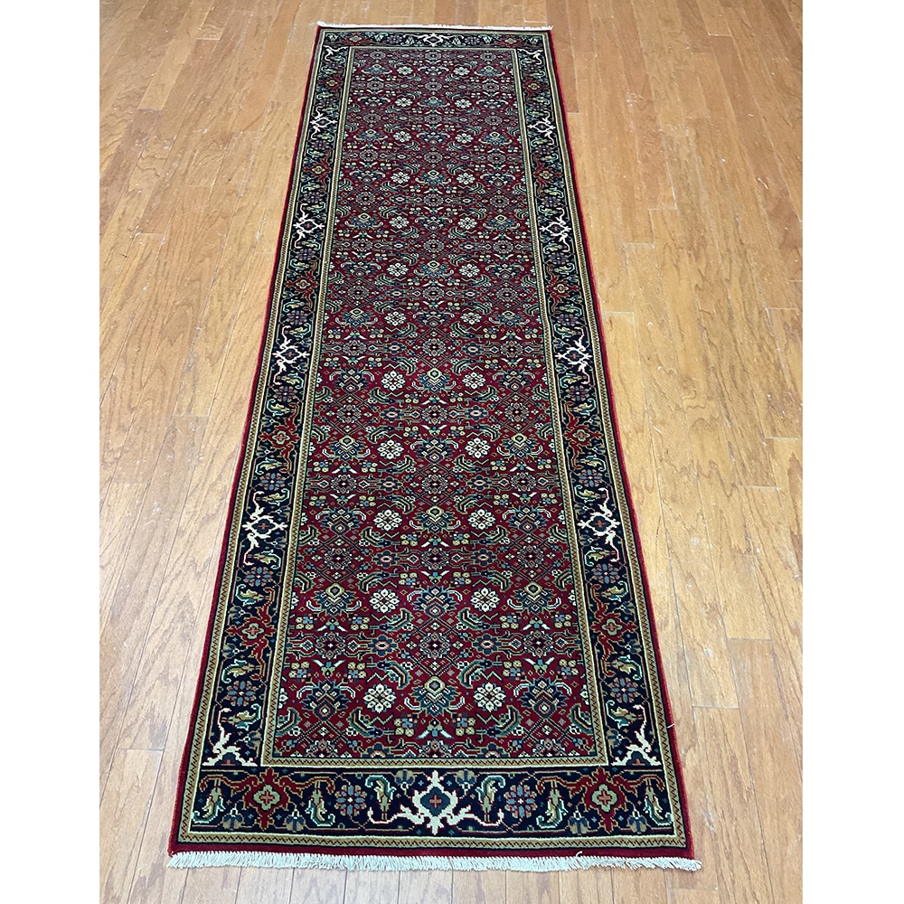 This rug is a unique piece of world art that will enhance your living space. The Herati design originated in Herat, Afghanistan and has been replicated by weavers in India and Iran. The design of this rug originated from the province of Herat in Afghanistan, however this rug was re-created in the Varanasi region of India, by Bhadohi village weavers. Natural vegetable dyes are used to give the rugs their rich colors.