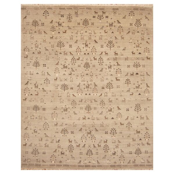 The Gabbeh designs originate in the Shiraz province of Iran, done by the Gabbeh villagers. The authentic and primitive look and design of the rugs are what makes them desirable. This particular rug was created in the Varanasi region of India, in the Bhadohi village, where weavers re-create the original Gabbeh design. The process of making a rug includes cleaning, washing and dyeing the wool which is sourced from local sheep.
