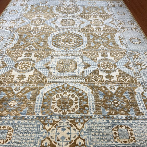 The Mamluk Dynasty of Egypt, originally enslaved soldiers from Turkey, came to power in the mid-13th century in their capital Cairo. The designs are characterized by geometric medallion patterns. The designs are traditional and follow older patterns yet have a modern look for today’s homes. This particular rug was made by village weavers settled in India using traditional methods of weaving. The process of making a rug includes cleaning, washing and dyeing the wool which is sourced from local villages.