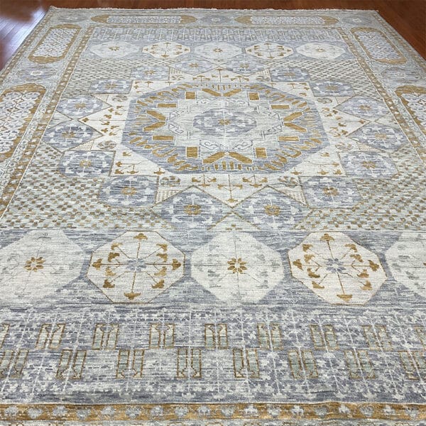 The Mamluk Dynasty of Egypt, originally enslaved soldiers from Turkey, came to power in the mid-13th century in their capital Cairo. The designs are characterized by geometric medallion patterns. The designs are traditional and follow older patterns yet have a modern look for today’s homes. This particular rug was made by village weavers settled in India using traditional methods of weaving. The process of making a rug includes cleaning, washing and dyeing the wool which is sourced from local villages.