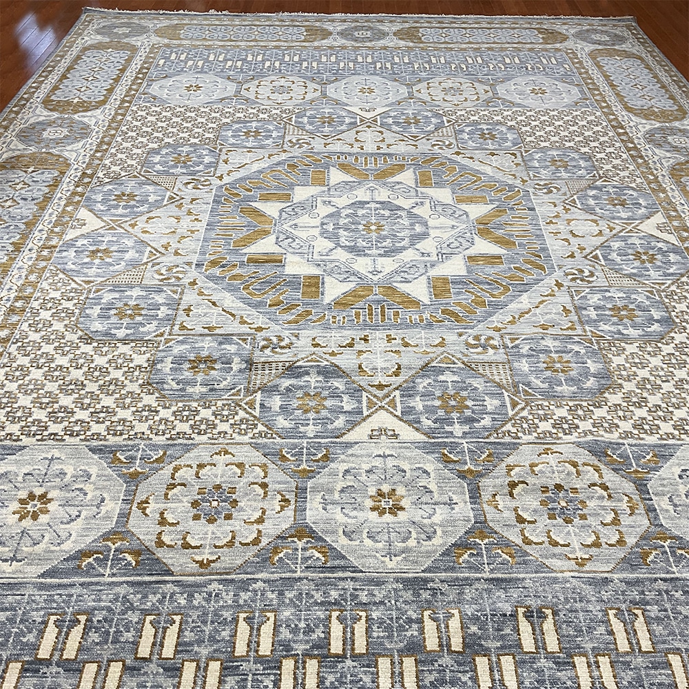 The Mamluk Dynasty of Egypt, originally enslaved soldiers from Turkey, came to power in the mid-13th century in their capital Cairo. The designs are characterized by geometric medallion patterns. The designs are traditional and follow older patterns yet have a modern look for today’s homes. This particular rug was made by village weavers settled in India using traditional methods of weaving. The process of making a rug includes cleaning, washing and dyeing the wool which is sourced from local villages.