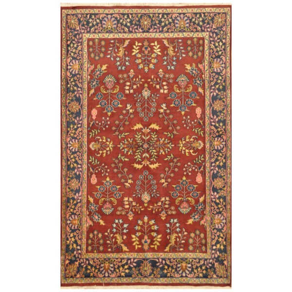Sarouk rugs were produced in the Arak region of Iran, made with traditional allover designs or symmetrical floral patterns. This rug’s design originated in the Sarouk region of Iran, however this particular rug was made by the village weavers in the Bhadohi village, in the Varanasi province of India.