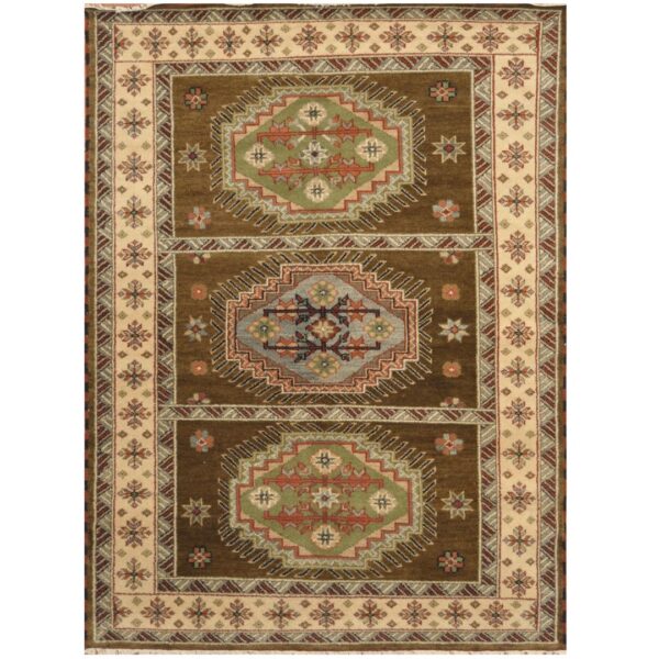 Kazaks are a type of Armenian rug that were historically woven in the southern portion of the Caucasus region of the Middle East. The production of rugs in that region is limited to the villages practicing traditional weaving, therefore this beautiful design has been reproduced in the Varanasi province of India, by the Bhadohi village weavers. Local elements of design and construction bring a unique beauty to the ancient patterns that the weavers create. The process of making a rug includes cleaning, washing and dyeing the wool which is sourced from local villages.