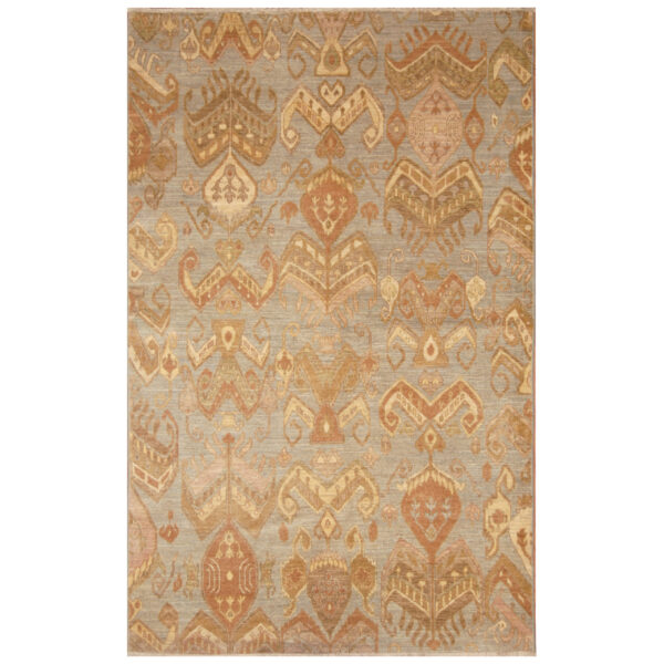 Ikat is a dying technique used to pattern textiles, but in the last decade, weavers in India, Afghanistan and Pakistan have used the Ikat designs in creating beautiful handmade rugs. This unique rug was made in the Varanasi region of India by the Bhadohi village weavers. Those vegetable dyes most commonly used are madder, the root of a spindly bush which grows abundantly in many carpet-producing area which is used to create a red color. Walnut peel is used for dark brown, pomegranate peel for light brown, and sparak which is a wild flower from the steppes, used for yellow.