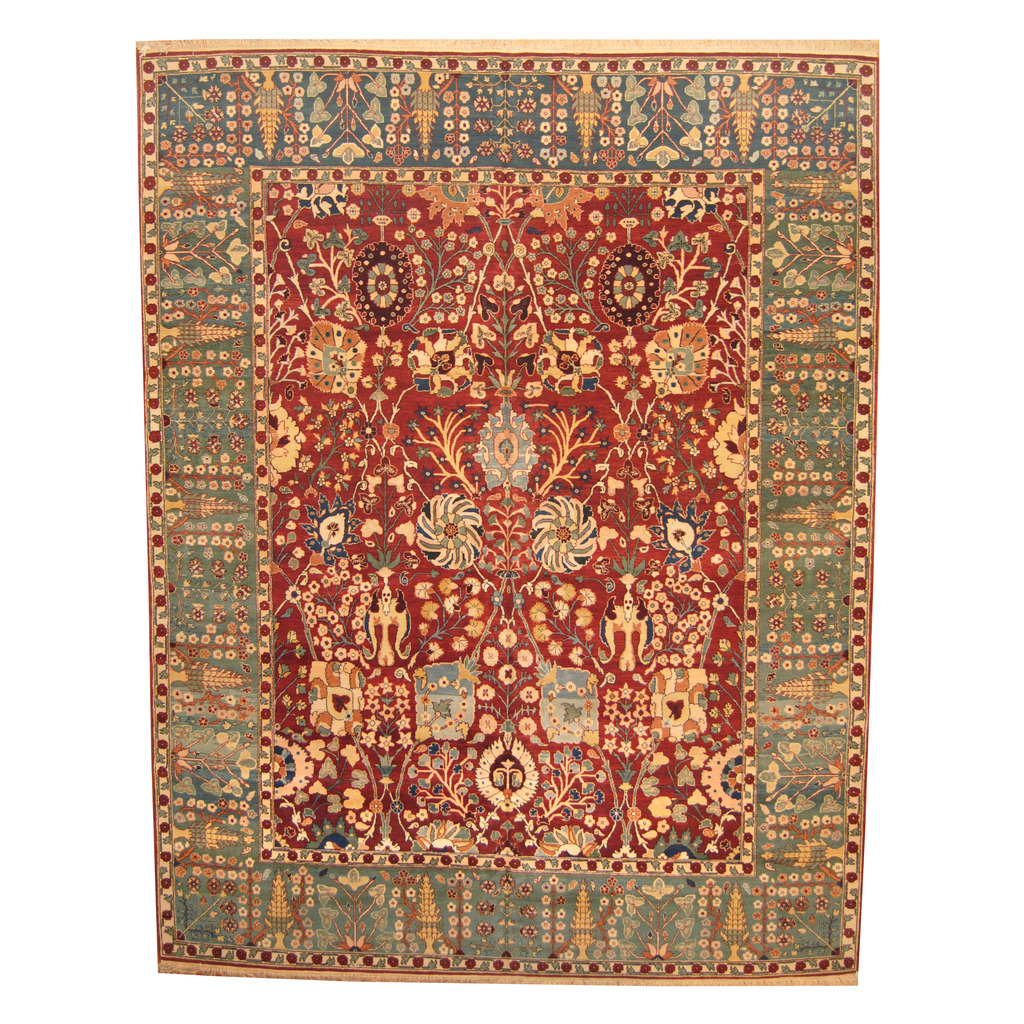 Oushak has produced some of the most decorative Turkish influenced rugs of all times. The antique Turkish Oushak design has been reproduced by Indian village weavers in the regions of Varanasi and Jaipur. This rug was made by weavers in the Bhadohi village of Varanasi.  Those vegetable dyes most commonly used are madder, the root of a spindly bush which grows abundantly in many carpet-producing areas which is used to create a red color, walnut peel which is used for dark brown, pomegranate peel used for light brown, and sparak which is a wild flower from the steppes, used for yellow.