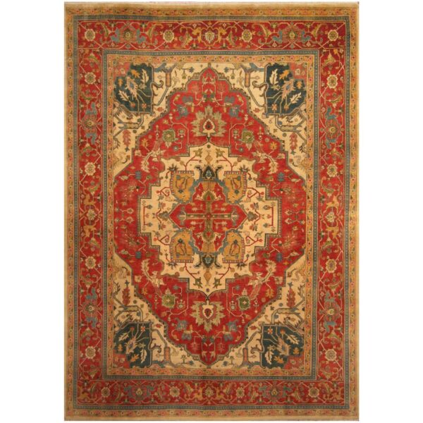 Serapi is a trade name given to better quality versions of Heriz rugs thought to have been woven before 1900. Heriz is a city located in northwestern Iran and near the city of Tabriz, and Heriz rugs are very famous worldwide. They have their own very unique style and are easily distinguishable. Although the design of this rug originated in Heriz, this particular rug was re-created by village weavers in the Bhadohi region of India. Village weavers do the entire process of shearing, washing, dyeing and weaving of the rugs. They clean, wash and dye the wool with pure vegetable dyes, and then weave the rug. Those vegetable dyes most commonly used are madder, the root of a spindly bush which grows abundantly in many carpet-producing area which is used to create a red color. Walnut peel is used for dark brown, pomegranate peel for light brown, and sparak which is a wild flower from the steppes, used for yellow.