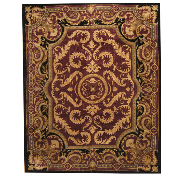 The design of this Aubusson rug originates from the French town of Aubusson, a small, picturesque town situated close to the mountains of the Massif Central. However, the design of this rug was copied and re-created by villagers in the Varanasi region of India. They do the entire process of shearing, washing, dyeing and weaving of the rugs.