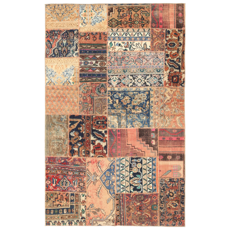 The remarkable patchwork rug is a one of a kind rug that was crafted using remnants of antique hand-knotted wool rugs. The remnants can come from torn or damaged pieces of Persian antique rugs that could no longer be used as one whole rug, so they are put together as a patchwork rug to preserve the good parts of these rugs.