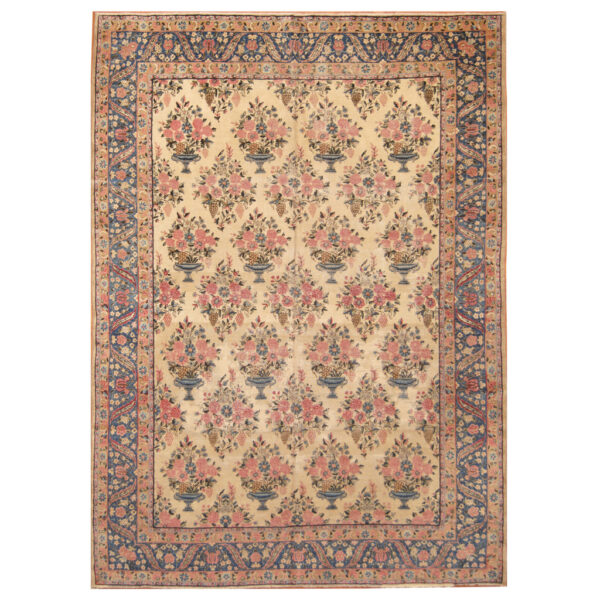 The Iranian province Kerman produces highly distinctive carpets primarily in highly floral medallion or all over designs. During the 16th and 17th century, these rugs were made by village weavers for the royal family, commissioned by the king and a popular name for them became ‘Royal Kermans.’ Continuing that tradition, this particular rug was made by village weavers following traditional practices. The process of making a rug includes cleaning, washing and dyeing the wool which is sourced from local sheep.