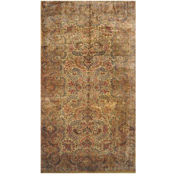 The Iranian province Kerman produces highly distinctive carpets primarily in highly floral medallion or all over designs. During the 16th and 17th century, these rugs were made by village weavers for the royal family, commissioned by the king and a popular name for them became ‘Royal Kermans.’ Continuing that tradition, this particular rug was made by village weavers in Lavar, which is located 80 miles north of Kerman, following traditional practices. The process of making a rug includes cleaning, washing and dyeing the wool which is sourced from local sheep.