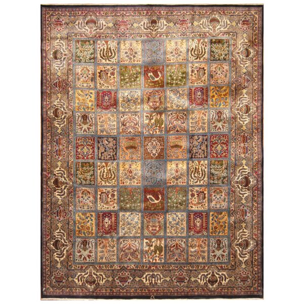 Kashmar rugs are easily distinguishable because of their large size and their unique patterns, which are characterized by the use of animals and people in the design. This beautiful Persian Kashmar rug is a rare and time-honored beauty, handmade by the Persian people living in the province of Khorasan in Eastern Iran. The process of making a rug includes cleaning, washing and dyeing the wool which is sourced from local sheep.