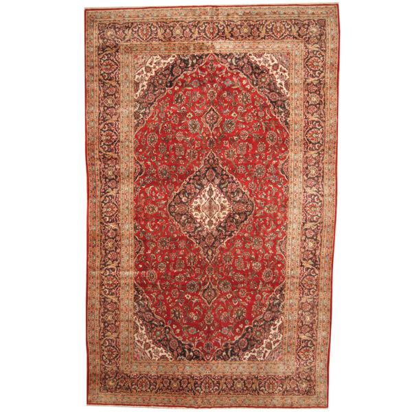 Kashan is a historic city in the province of Isfahan. This region is famous for their rug weaving, which goes back to the Safavieh dynasty workshop rugs, that was created in Kashan county. Most of the older rugs that have been woven in Kashan by village weavers use the imported wool from Manchester UK and New Zealand for the production of their rugs. This particular rug was made in the 1960’s by village weavers in Kashan. The process of rug making includes cleaning, washing and dyeing the wool, and then weaving the rug with vegetable-dyed wool.